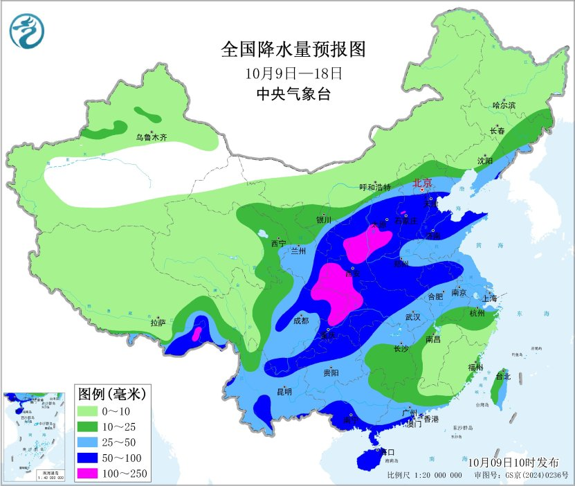 未来10天(10月9日至18日),西北地区东部、华北、黄淮、四川盆地、江汉、华南南部等地累计降水量有40~80毫米,部分地区100~150毫米,局地200毫米以上;上述大部地区降雨量较常年同期偏多七至九成,部分地区偏多1~3倍,我国其余大部降水偏少。