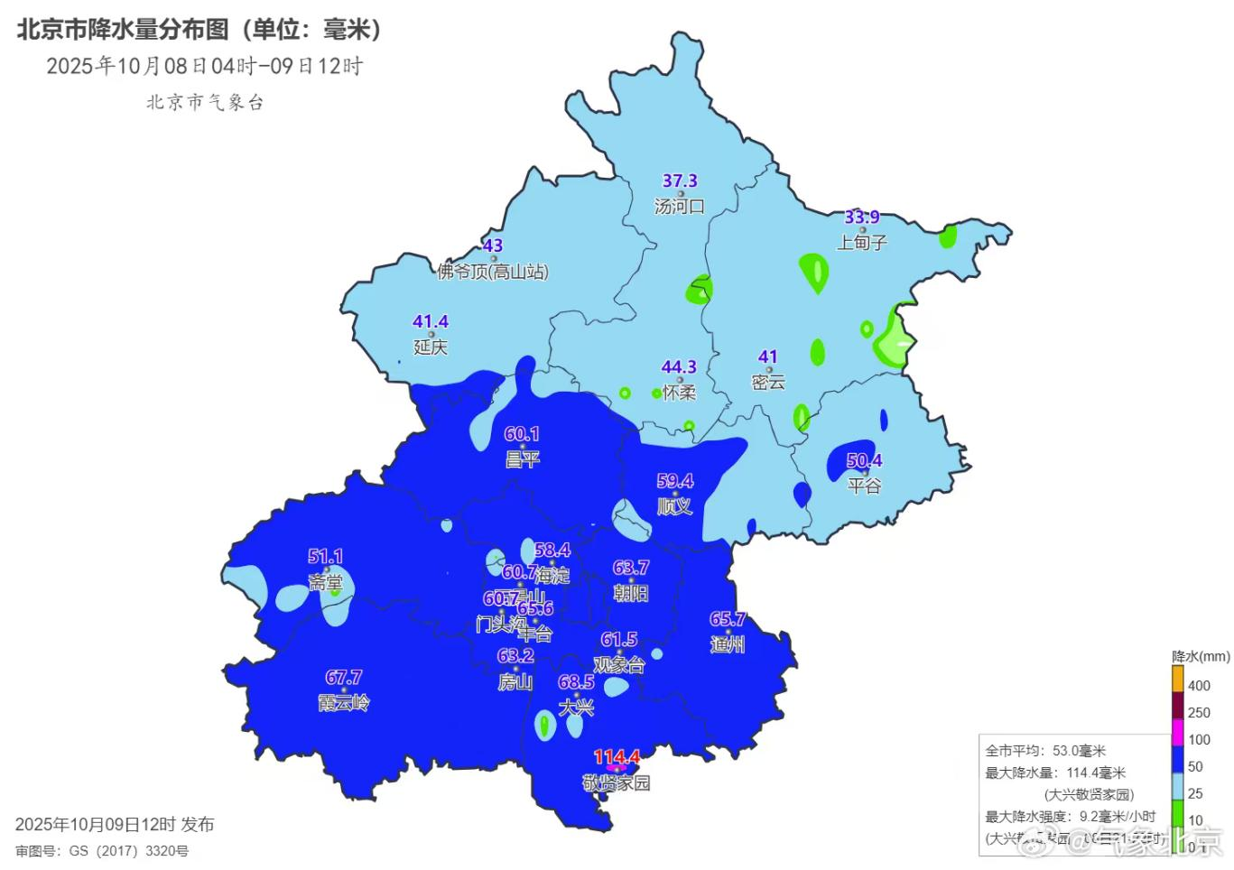 中央气象台10月9日10时继续发布暴雨蓝色预警:预计,10月9日14时至10日14时,陕西北部、山西中部、河北中部、北京南部、天津、山东中北部等地部分地区有大到暴雨(50~90毫米)。上述部分地区伴有短时强降水(最大小时降雨量20~30毫米)。