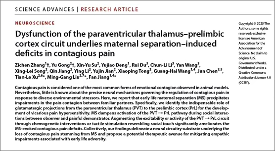 童年时期遭遇的逆境,如虐待、忽视或母婴分离,不仅会造成即时伤害,更会深远影响个体成年后的心理健康与社会功能。其中,共情能力的缺陷尤为显著,但其背后的大脑机制一直不甚明确。10月9日,国家儿童医学中心、上海交通大学医学院附属上海儿童医学中心发育行为儿科江帆教授、浙江省瓯江实验室刘明刚研究员与上海交通大学医学院徐天乐教授团队合作在《科学·进展》上发表研究论文,首次系统阐明生命早期的母婴分离应激如何导致成年后对同伴疼痛“感同身受”的能力下降。